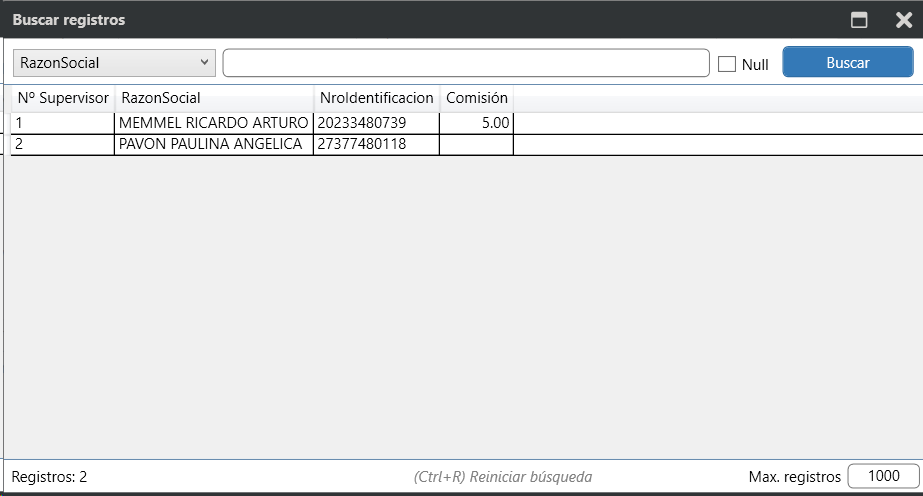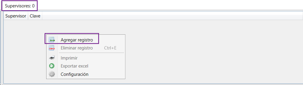 Al seleccionar agregar registro el sistema le arroja el listado de supervisores configurados desde el ABM de Entidades.