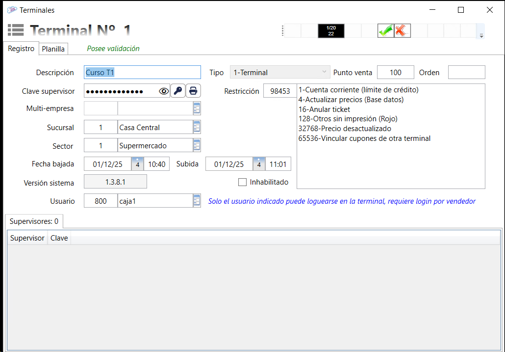 Supervisor: Para cada terminal es posible asignar uno o varios supervisores que poseen la facultad de aprobar las restricciones que tiene la caja con su clave de Supervisor.