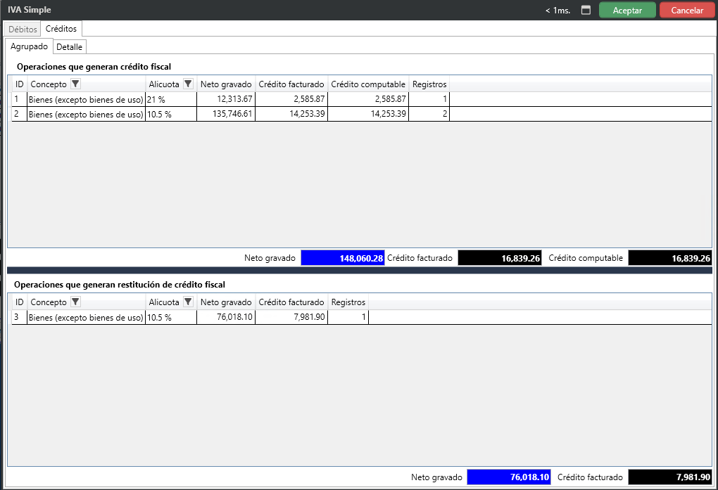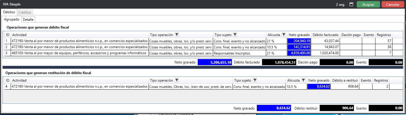 En el agrupado, en la parte inferior, se podrá visualizar las operaciones que generan restitución fiscal y el valor total.