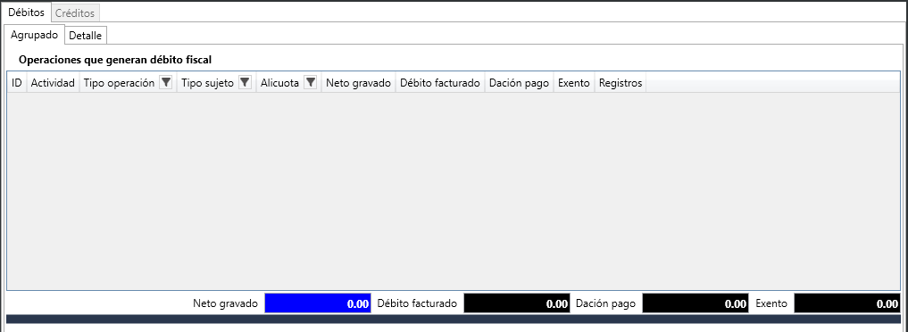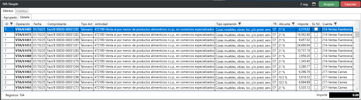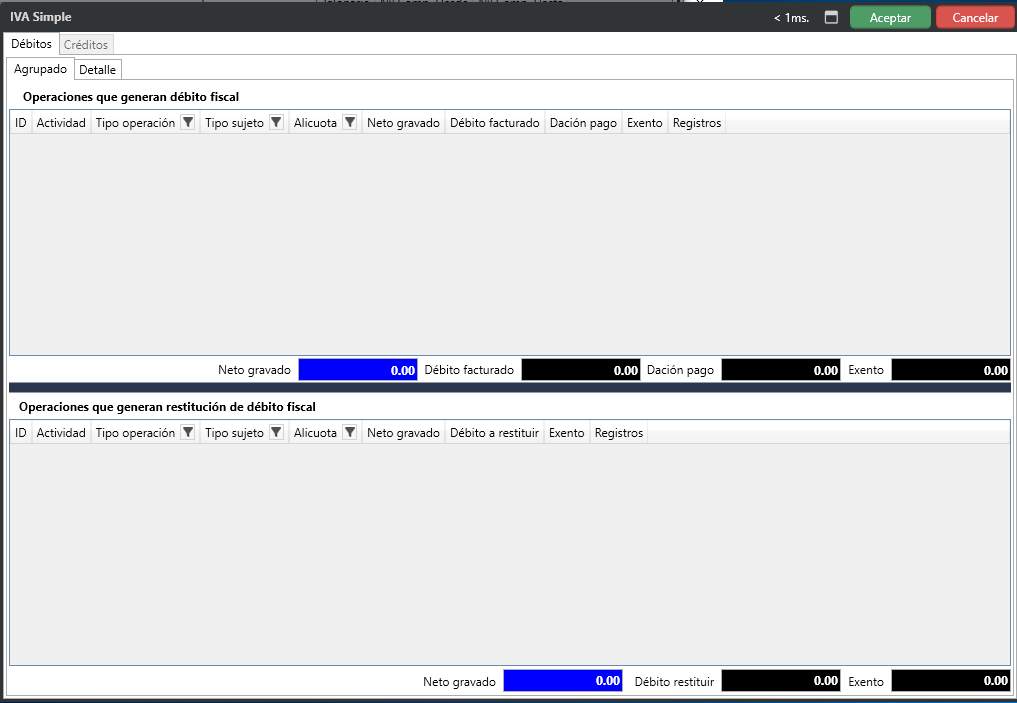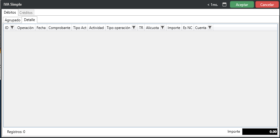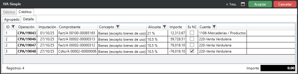 Se habilita la pantalla para visualizar los datos que se registran para el archivo de IVA Simple, tanto para créditos y débitos, es la misma pantalla.