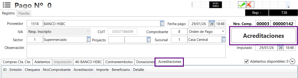 Para cargar el débito es necesario seleccionar como proveedor al banco pagador, posicionarse en la pestaña Acreditaciones y Con el boton de Acreditaciones buscar el cheque pagado. Véase Selector de Acreditaciones