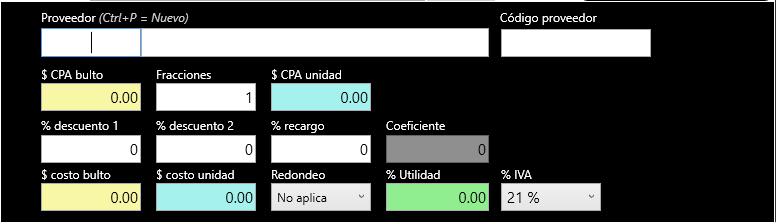Proveedor: puede buscar o asignar el proveedor, o darlo de alta presionando las teclas CTRL+P, para acceder a la Carga Rápida Clientes/Proveedores. También puede asignar el código de proveedor asociado al producto.