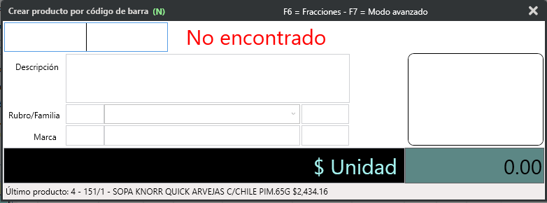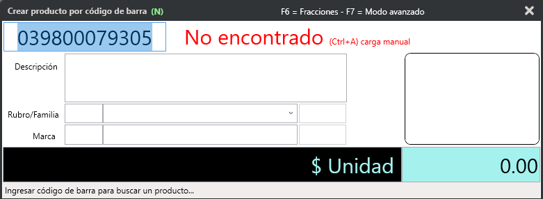 Cuando se habilite la opción CTRL+A para carga manual, se podrá cargar los datos del código de barra para dar alta al producto