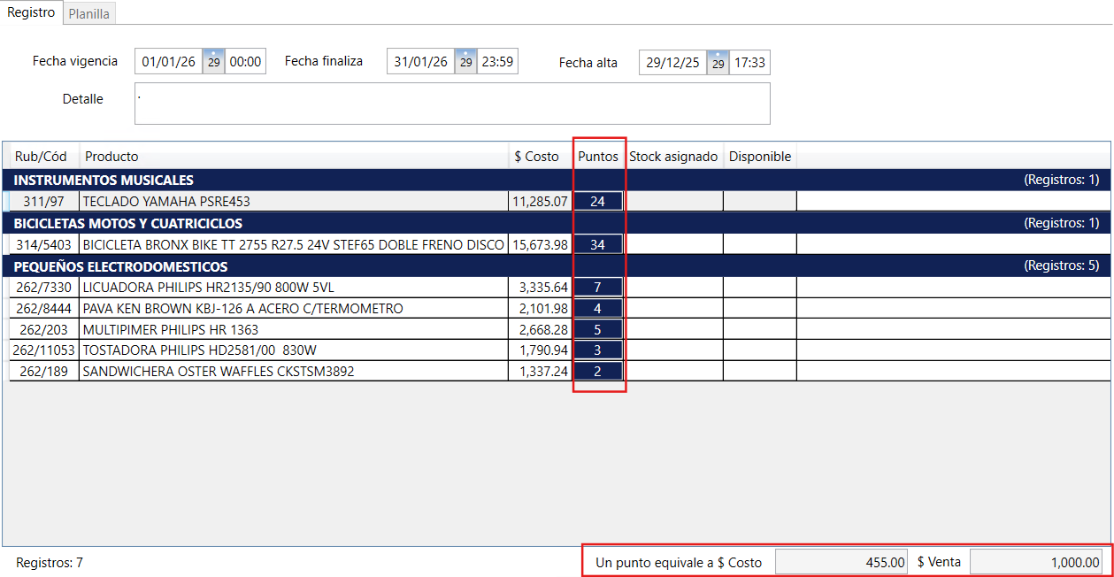 En caso de ser necesario puede establecer otro importe en la columna de Puntos y finalmente debe cargar el Stock asignado.