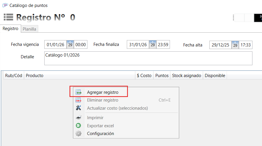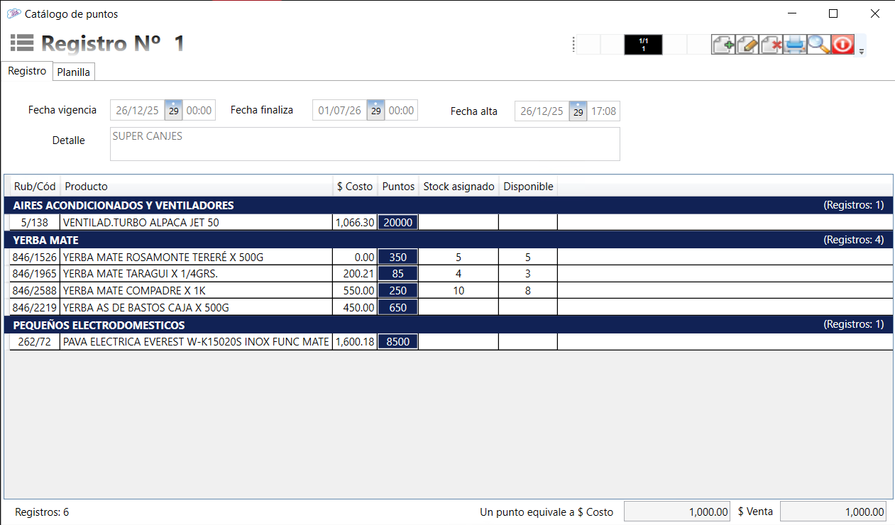 Desde esta ventana, habilitada para el Módulo de Gestión de Puntos, se genera el catálogo y stock disponibles para realizar los Canjes de los productos que lo componen por los puntos acumulados de clientes.