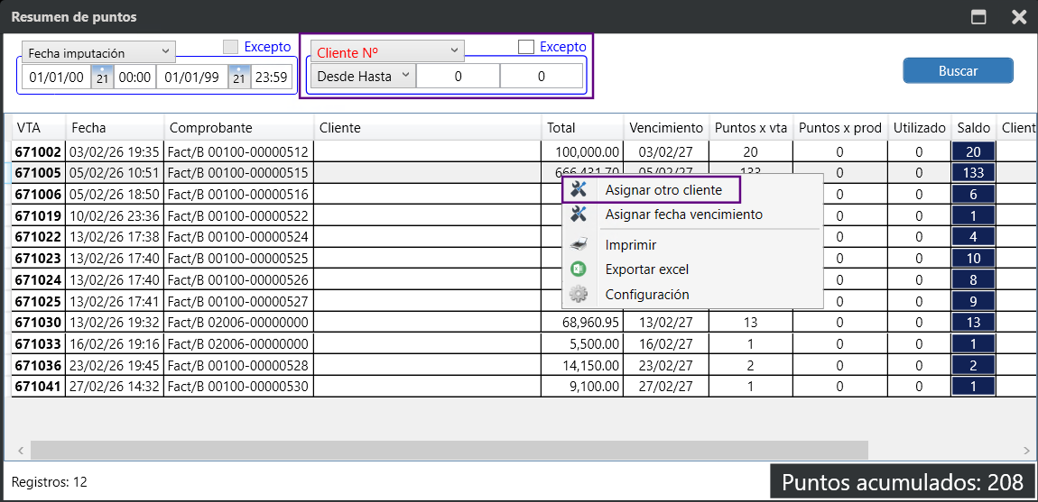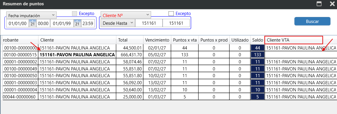 Desde esta ventana es posible realizar consultas de puntos acumulados, para ello es debe indicar fecha de la operacion y/o el cliente por el cual se realiza la consulta y luego hacer clic en el boton .