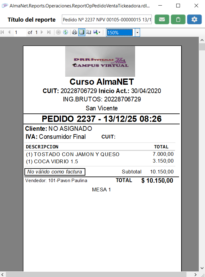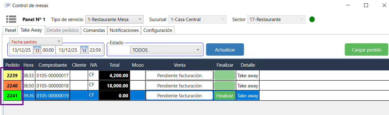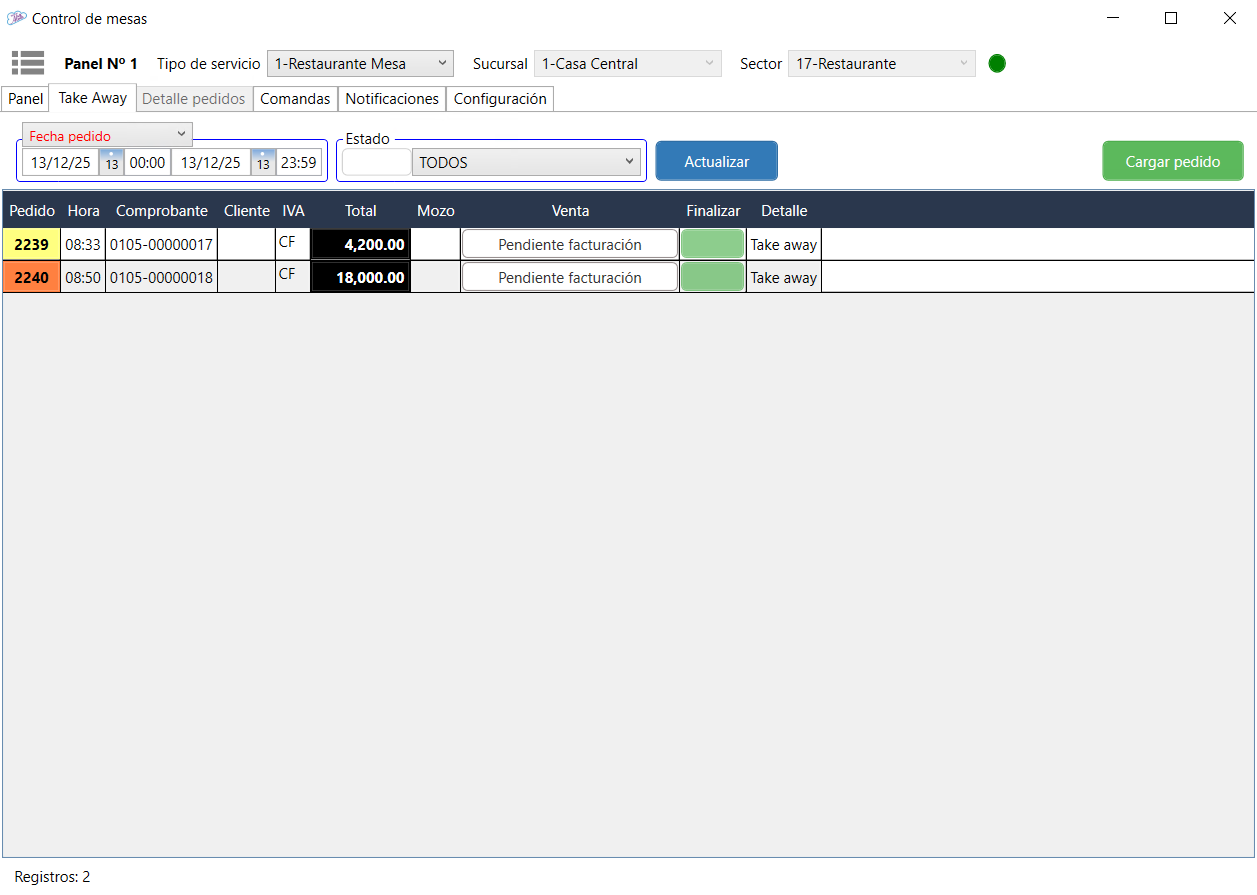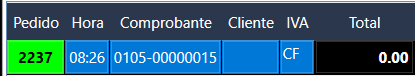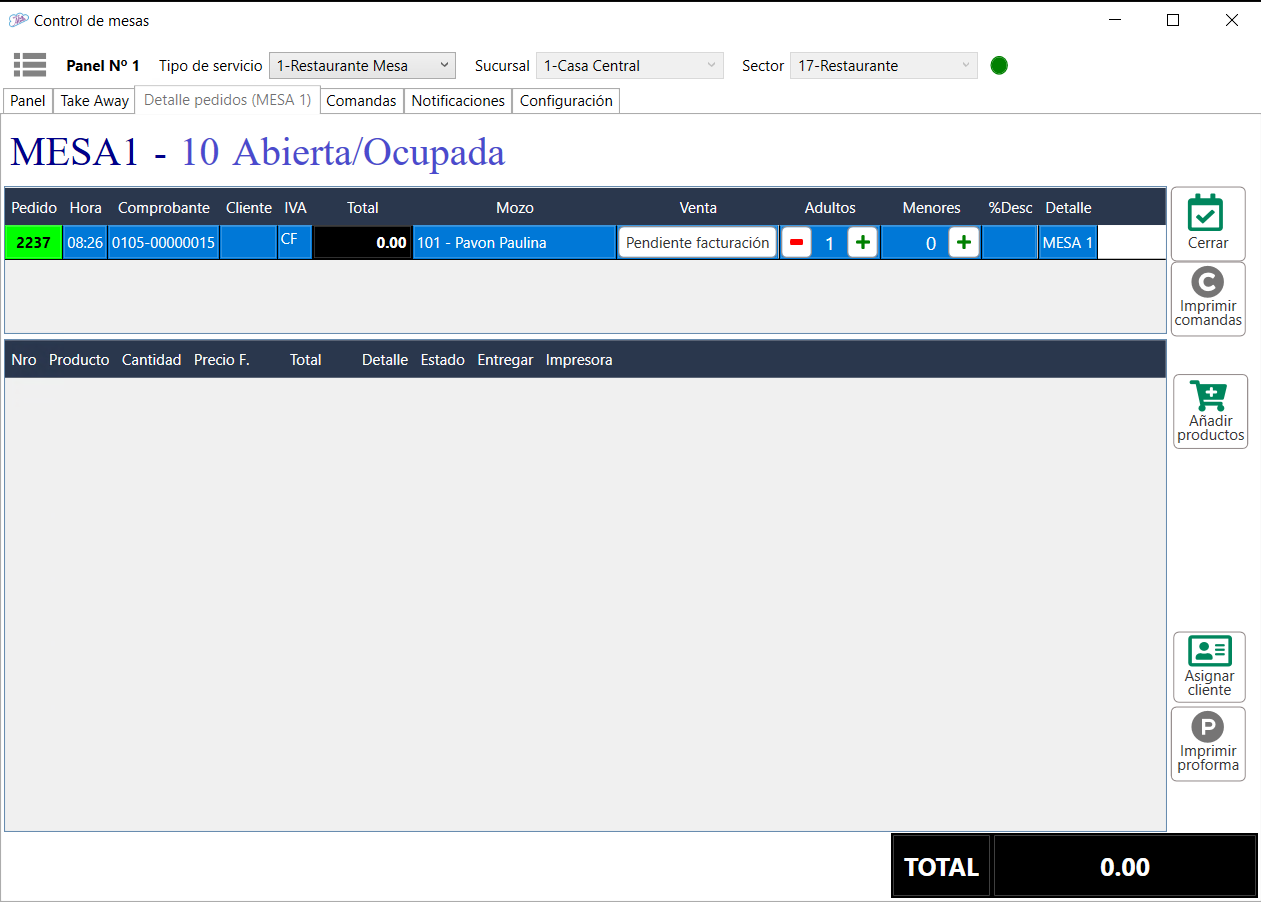 Esta pestaña esta directamente relacionada a cada uno de los pedidos que se encuentran en proceso. Se habilita ingresando desde la pestaña Panel con doble clic en la mesa o desde la pestaña Take Away con doble clic en el número de pedido.