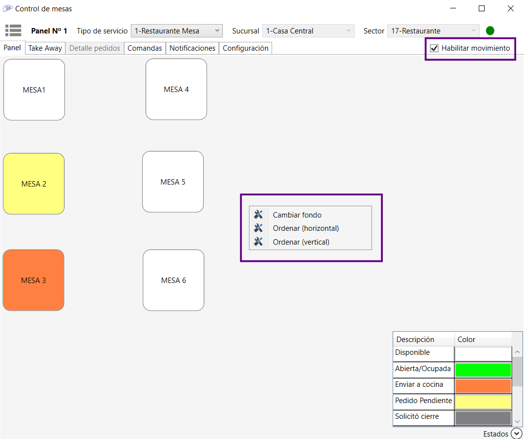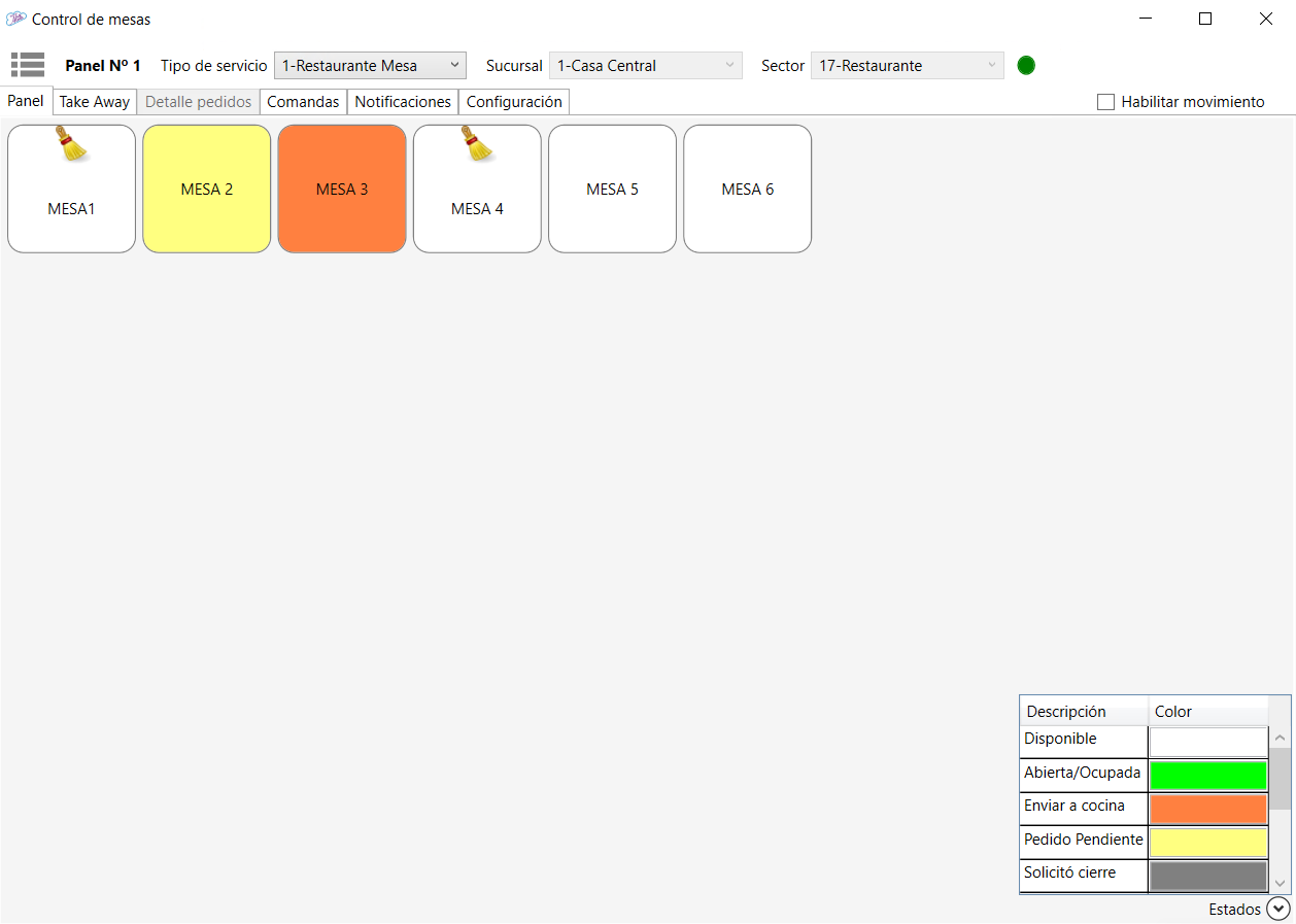 Mesas / Habitaciones: En la ventana se visualizan unicamente las mesas y/o habitaciones vinculadas al panel.