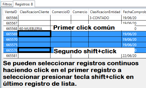 Hacer un click en el primer registro y luego presionando la tecla Shift+Clik en el último registro de una lista continua, permite seleccioanr todos los registros entre ambos click: