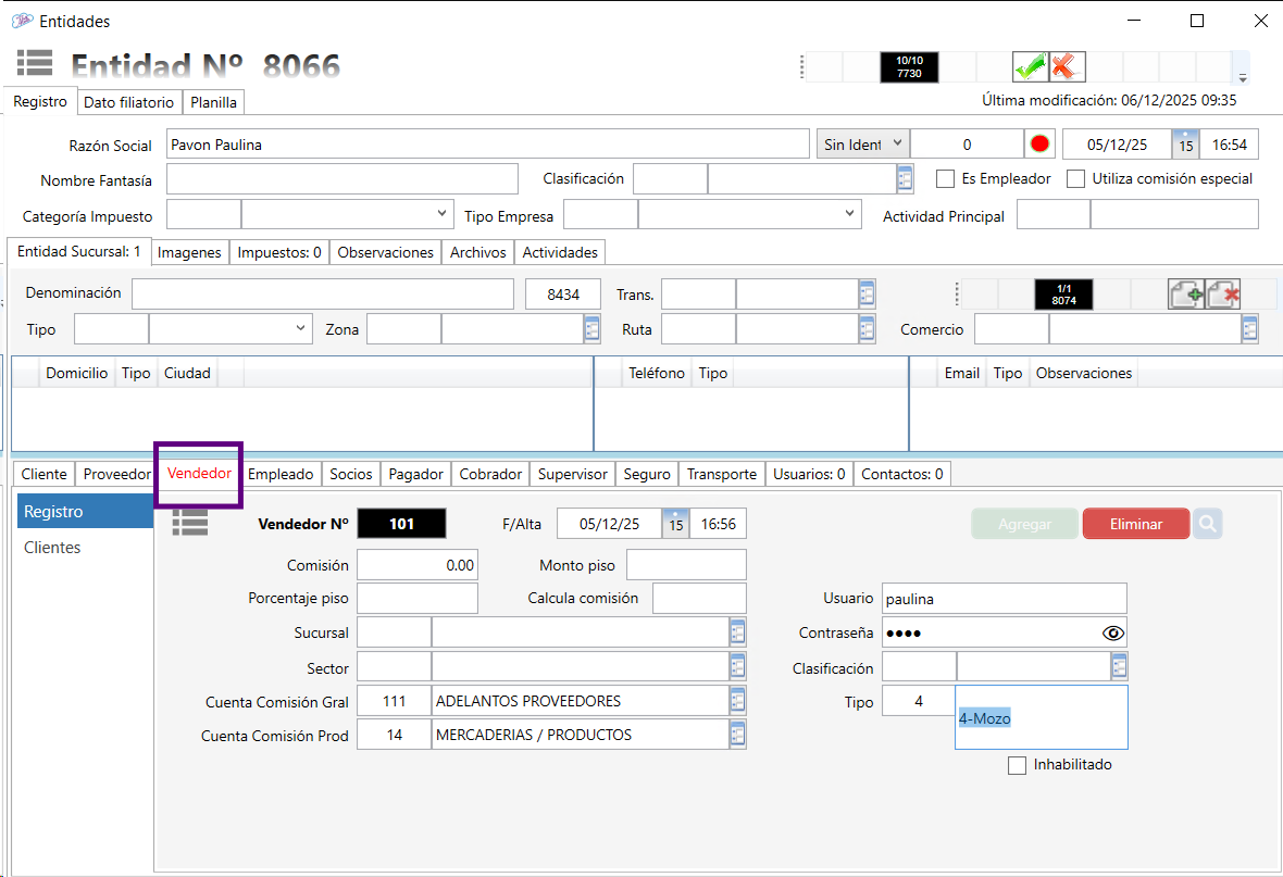 Nota: Además de vendedor los empleados deben estar habilitados como Proveedores y Empleados.