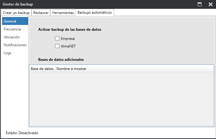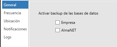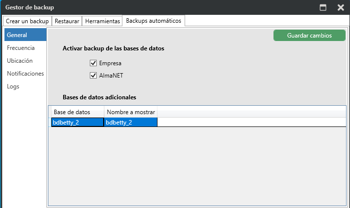 Bases Adicionales: permite agregar otras bases de datos a los backup automáticos (Multi-Empresas)