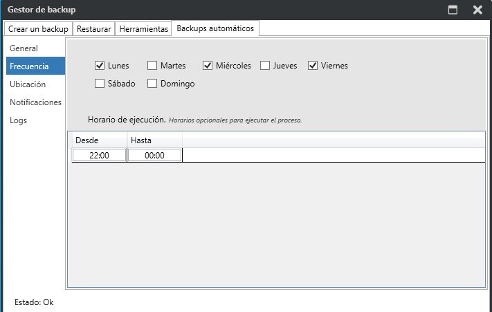 Pestaña frecuencia: permite configurar días y horarios para realizar los backups.
