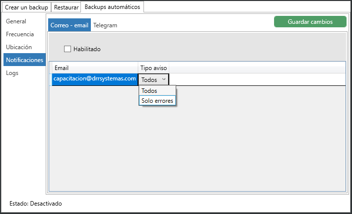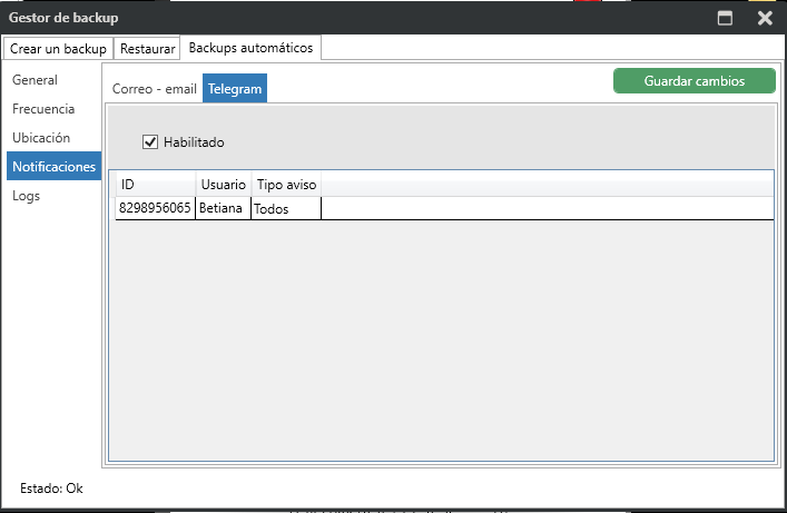 Notificaciones: Permite establecer avisos por vía Correo o Telegram, para recibir indicaciones sobre el proceso de backup.