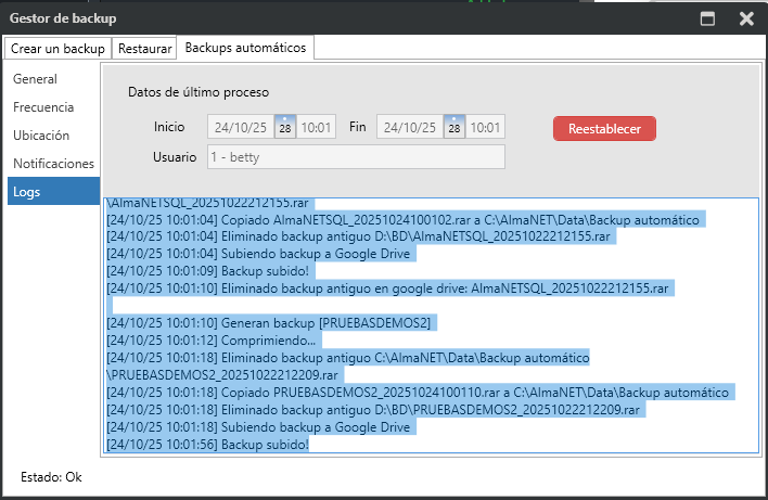 Logs: permite visualizar los detalles de la generación de backup, detalles tanto cunado es correcto como cuando tiene errores.