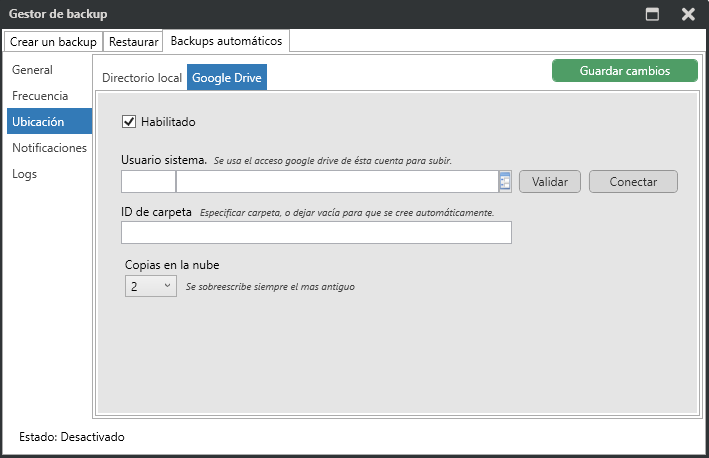 Google Drive: permite generar una carpeta de resguardo para las copias. deberá seleccionar un usuario que ya tenga los permisos activados y validarlos o con el botón conectar, generar la vinculación. (Véase Activar Permisos Google)