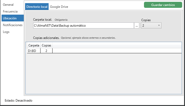 Carpeta local: es la ubicación donde se guardarán las copias, se puede asignar la cantidad máxima de copias a resguardar. Eliminando siempre la más antigua.