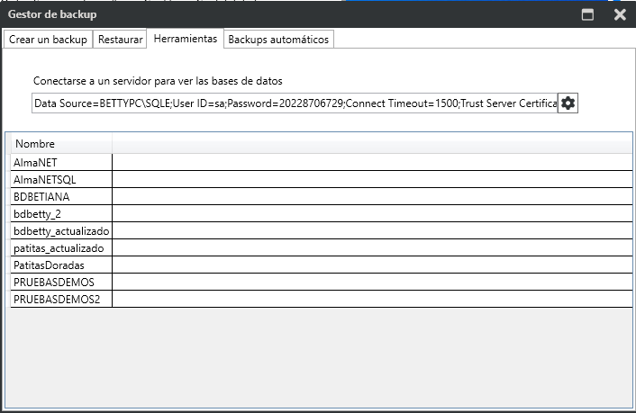 La sección de herramientas, permite generar la conexión para poder visualizar las bases de datos existentes (Casos Multi-Empresas)